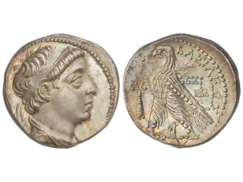Tetradracma. 129-125 a.C. DEMETRIO II. TIRO. REINO SELÉUCIDA. Anv.: Busto diademado a derecha. Rev.: Águila en pie a izquierda sobre proa, alrededor leyenda, monogramas y clava. 14,21 grs. AR. Bella pátina y brillo original. MUY BONITA. HGC 9-970; Se-7105. EBC+.