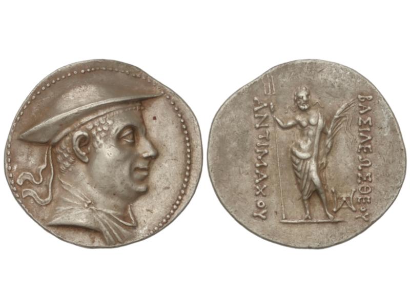 Tetradracma. 180-170 a.C. ANTIMACO I. BACTRIA. Anv.: Busto diademado, drapeado y coracero a la derecha, portando kausia. Rev.: [[g1g0h7g8h0g4i3h7]] [[g7g4h4h9]] ANTIMAXOY. Poseidón de pie, de frente, con el tridente en la mano derecha y la palma con cintas en la izquierda