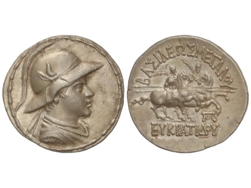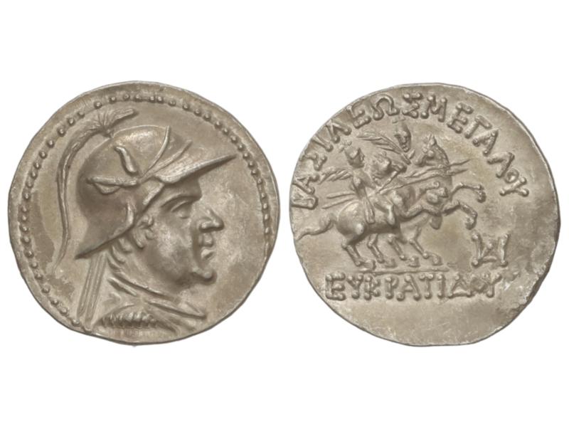 Tetradracma. 170-145 a.C. EUKRATIDES I. BACTRIA. Anv.: Busto con casco a derecha adornado de oreja y cuerno de toro. Rev.: BA[[h7]]I[[h0]]E[[i3h7]]ME[[g2]]A[[h0]]OY EYKPATI[[g3]]OY. Los Dióscuros a caballo a derecha con lanza y palma, a derecha monograma [[h5]]O. 16,89 gr