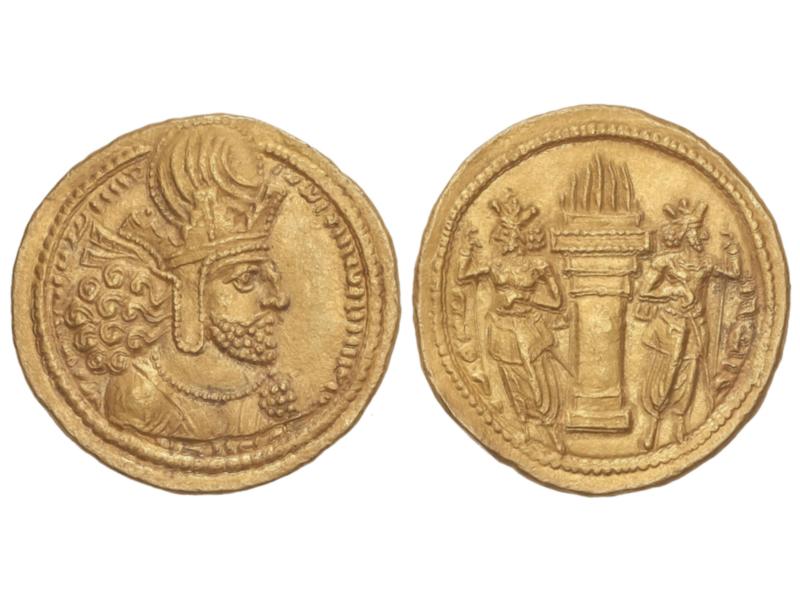 Dinar. 260-272 d.C. SHAPUR I. Ceca I ``Ctesifonte´´, Fase II. Anv.: Busto drapeado a derecha, con diadema y corona mural, rematado por un korimbos. Rev.: Altar de fuego, flanqueado por dos asistentes reales con coronas murales. 7,20 grs. AU. Shapur I, segundo “shahanshah”