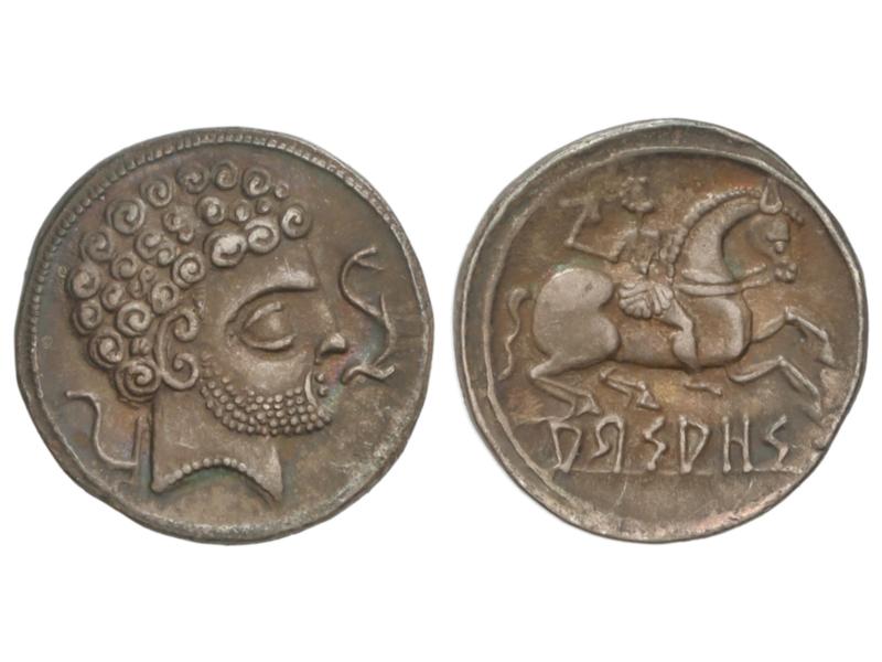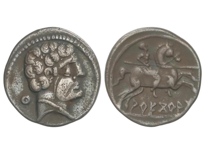 Denario. 120-80 a.C. ARSAOS (Zona de NAVARRA). Anv.: Cabeza barbada a derecha, entre arado y delfín. Rev.: Jinete con dardo a derecha, debajo leyenda ibérica ARSAOS sobre linea. 4,08 grs. AR. Muy bella con pátina. BUEN ANVERSO. AB-276; ACIP-3016. EBC/MBC+.