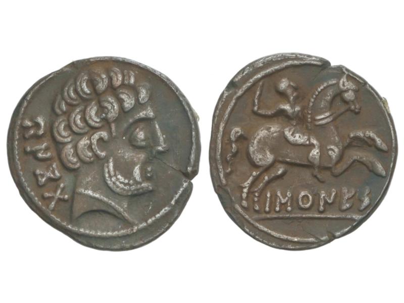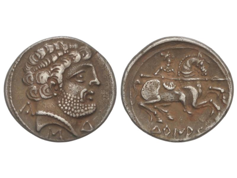 Denario. 180-20 a.C. BOLSCAN (HUESCA). Anv.: Cabeza barbada a derecha, detrás letras ibéricas BoN. Rev.: Jinete con lanza a derecha, debajo leyenda ibérica. 3,97 grs. AR. Pátina. AB-1911; ACIP-1413. EBC-.