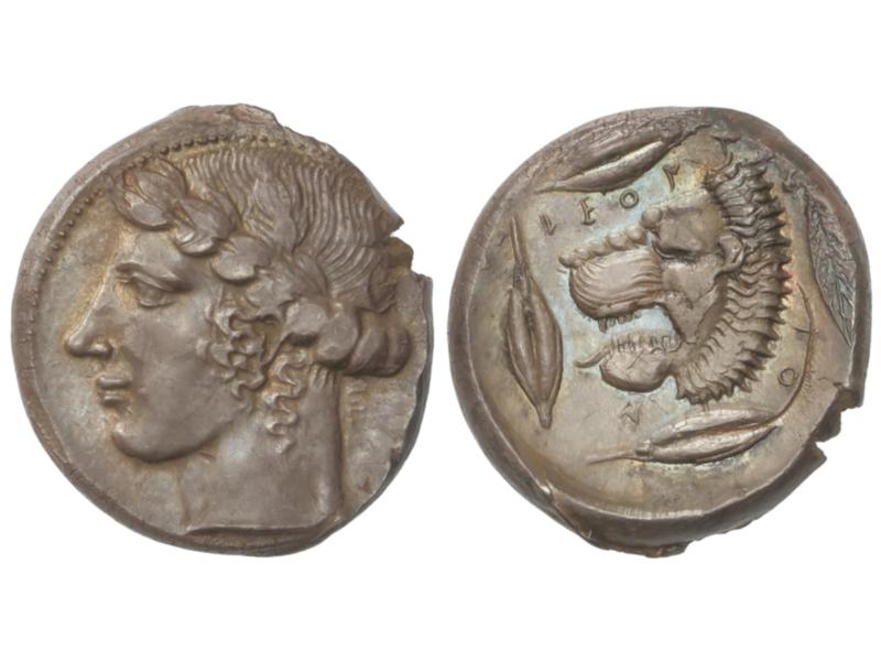 Tetradracma. 466-422 a.C. LEONTINI. SICILIA. Anv.: Cabeza de Apolo laureado a izquierda. Rev.: LEONTINON. Cabeza de león a izquierda, alrededor cuatro granos de trigo. 17,27 grs. AR. Bonita pátina de colección antigua. BELLA. HGC 2-671; SNG ANS-257. EBC.