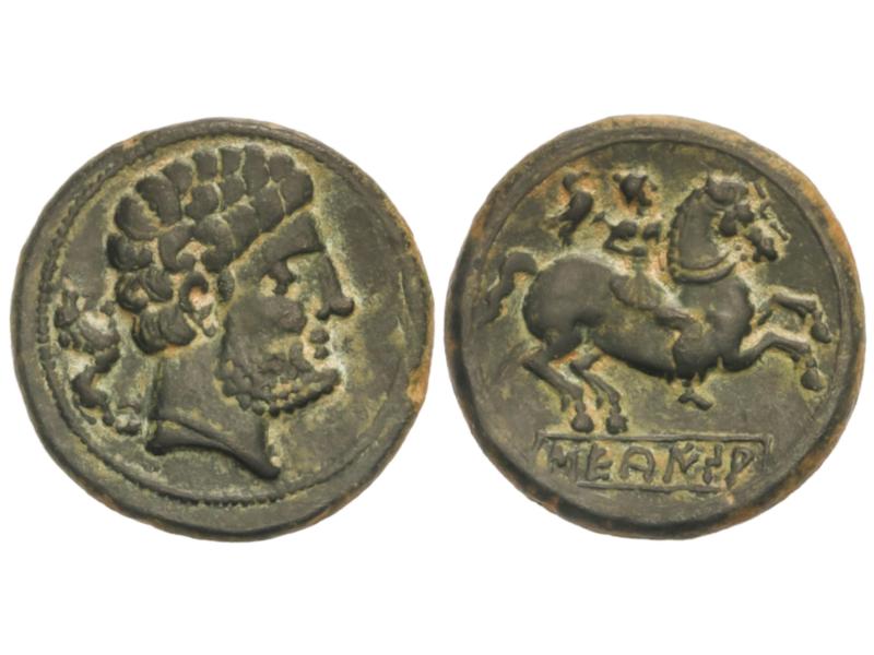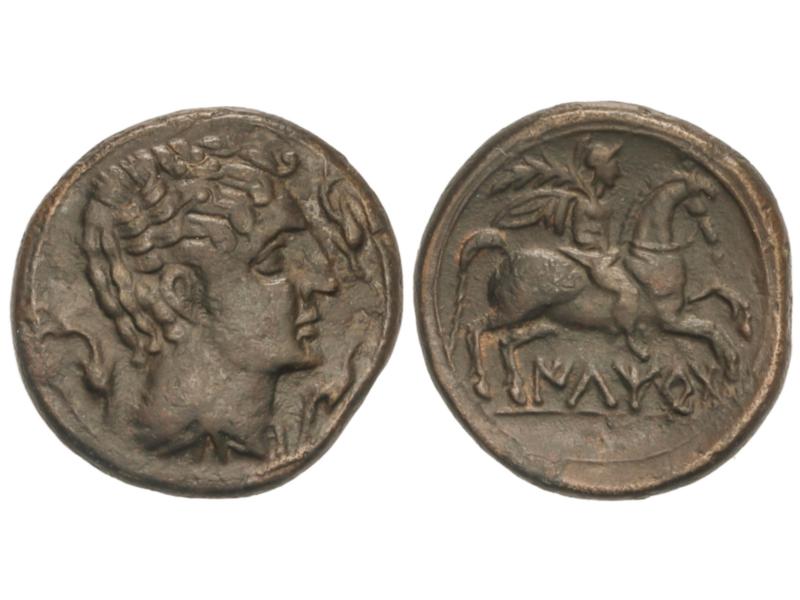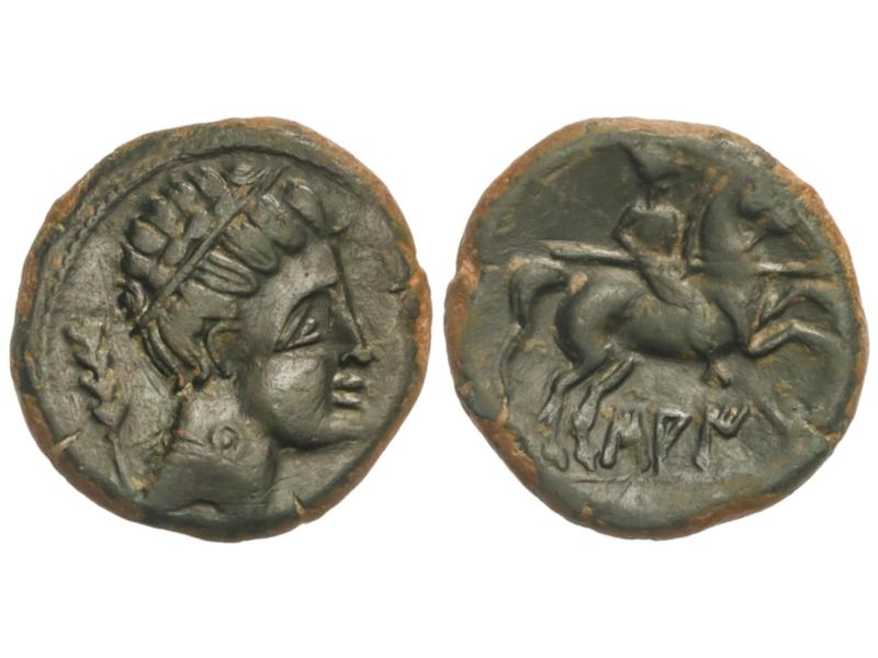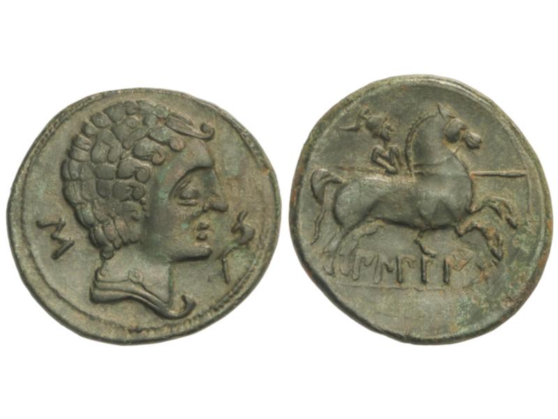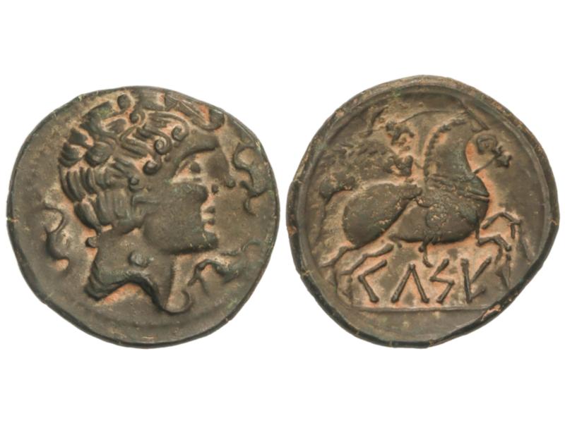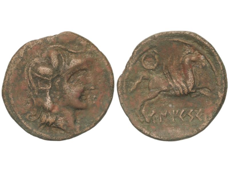 As. 130-90 a.C. UNTICESCEN (L´ESCALA EMPURIES, Girona). Anv.: Cabeza de Palas a derecha. Rev.: Pegaso a derecha, encima láurea, debajo leyenda ibérica. 12,14 grs. AE. ESCASA. AB-1210; ACIP-999. MBC.