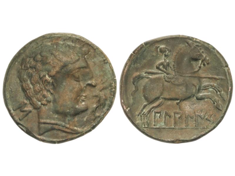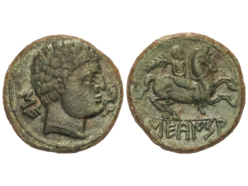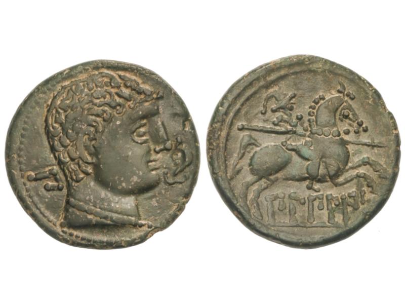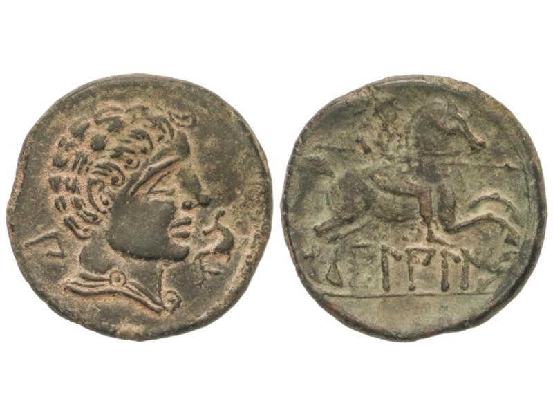 As. 120-20 a.C. SECAISA (BELMONTE, Zaragoza). Anv.: Cabeza masculina a derecha entre dos delfines. Rev.: Jinete con lanza a derecha, debajo leyenda ibérica. 8,99 grs. Pátina verde. AB-2131; ACIP-1560. EBC-/MBC+.