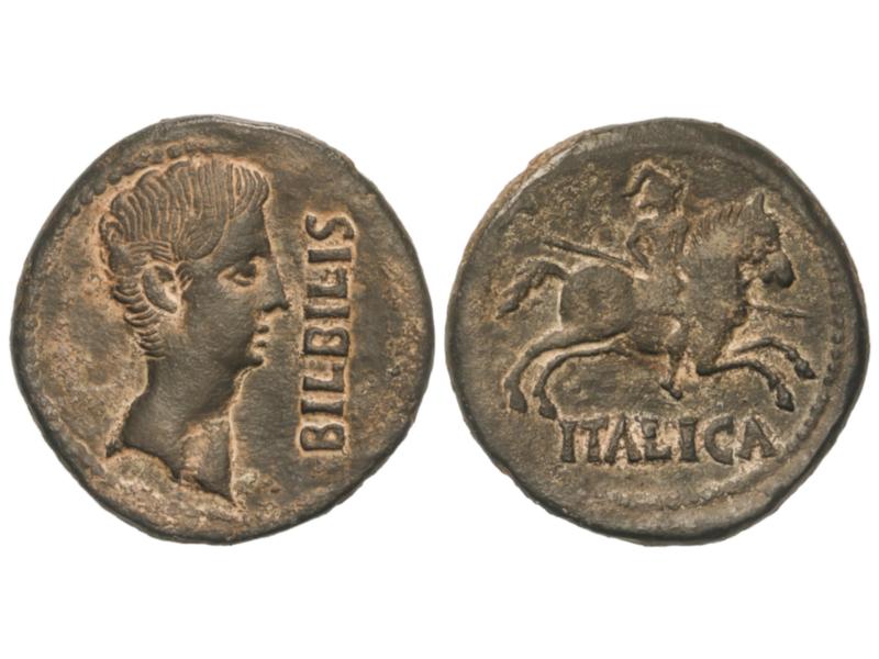 As. 30-20 a.C. ACUÑACIONES DE TRANSICIÓN. BILBILIS (CALATAYUD, Zaragoza). Anv.: Cabeza de Augusto a derecha, delante BILBILIS. Rev.: Jinete con lanza a derecha, debajo ITALICA. 15,08 grs. Pátina. ESCASA. AC-270. EBC-.