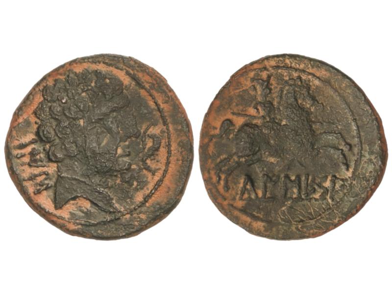 As. 120-20 a.C. LAGINE (Zona de Aragón). Anv.: Cabeza masculina a derecha con adornos en el cuello, rodeada por tres delfines. Rev.: Jinete con palma a derecha, debajo leyenda ibérica. 8,31 grs. Pátina. BONITA PIEZA. AB-1656; ACIP-1505. EBC-.