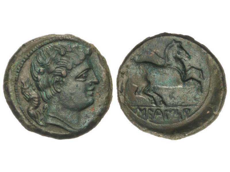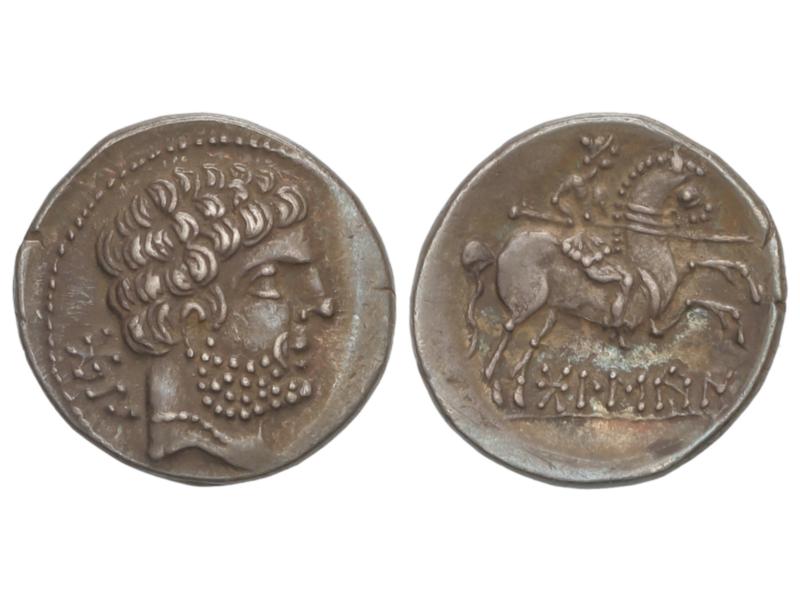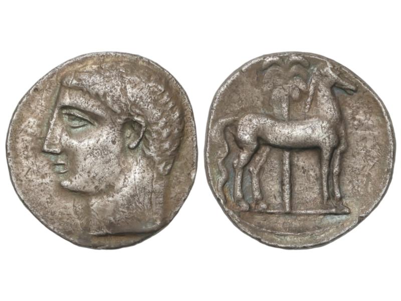 Shekel. ACUÑACIONES HISPANO-CARTAGINESAS. CARTAGO NOVA. Anv.: Cabeza masculina de tamaño grande a izquierda. Rev.: Caballo a derecha, detrás palmera. 7,07 grs. Leve pátina irisada. RARA. ACIP-606; AB-547; Vill-67. MBC+.