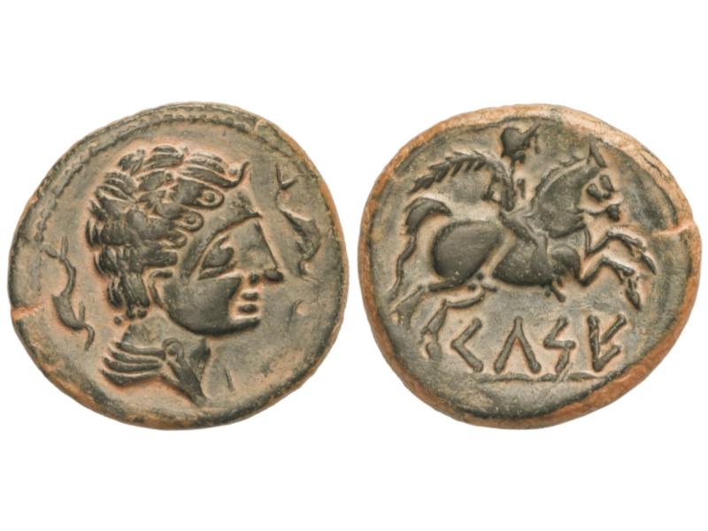 As. 120-50 a.C. CELSE (VELILLA DE EBRO, Zaragoza). Anv.: Cabeza masculina a derecha con manto y fíbula, rodeada por tres delfines. Rev.: Jinete con palma a derecha, debajo leyenda ibérica. 16,27 grs. Bonita pátina de tonos terrosos. BUEN EJEMPLAR. AB-771; ACIP-1483. EBC/EBC-.