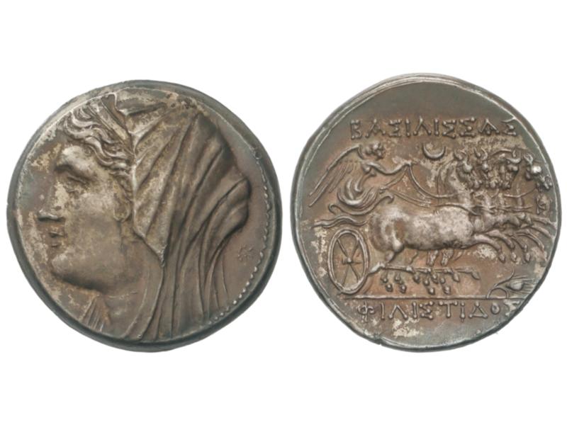 Tetradracma. 359–336 a.C. FILIPO II Acuñación postuma en tiempos de FILIPO III y KASSANDER. MACEDONIA. Anv.: Cabeza de Zeus laureado a derecha. Rev.: Jinete marchando a derecha, debajo serpiente y escudo. 14,29 grs. AR. Espectacular pátina de tonos irisados. BELLÍSIMA. Le