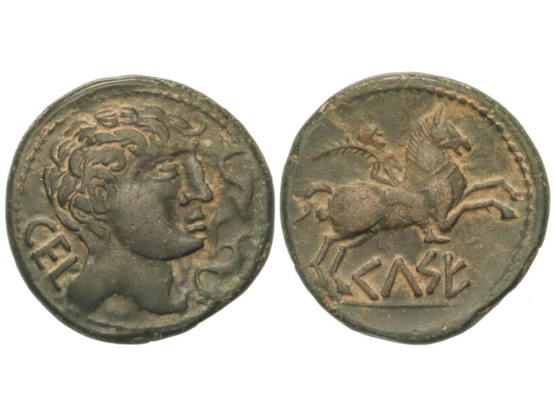 As. 120-50 a.C. CELSE (VELILLA DE EBRO, Zaragoza). Anv.: Cabeza masculina a derecha con manto y fíbula, rodeada por tres delfines. Rev.: Jinete con palma a derecha, debajo leyenda ibérica. 15,36 grs. AB-771; ACIP-1483. EBC-/MBC+.