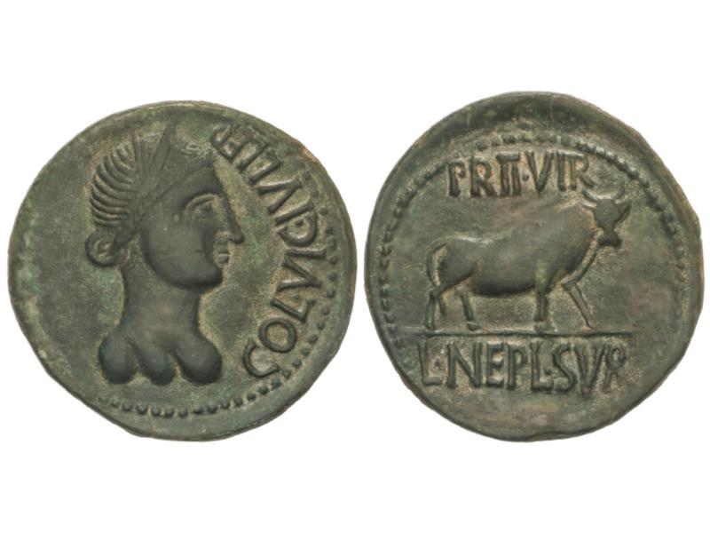 As. 50-30 a.C. ACUÑACIONES DE TRANSICIÓN. CELSA (VELILLA DE EBRO, Zaragoza). Anv.: COL. VIC. IVL. LEP. Busto femenino a derecha. Rev.: PR. II VIR. L. NEP. L. SVR. Toro a derecha. 14,66 grs. Pátina verde oscura. AB-795; ACIP-1494. MBC+.