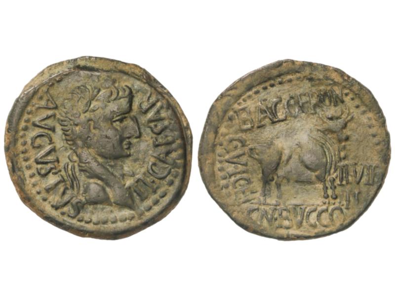 As. 14-37 d.C. ÉPOCA DE TIBERIO. CELSE (VELILLA DE EBRO, Zaragoza). Anv.: TI. CAESAR AVGVSTVS. Cabeza laureada a derecha. Rev.: BACC. FRONT. CN. BVCCO. II VIR. II C. V. I. CEL. Toro a derecha. 12,83 grs. Pátina. AB-819; ACIP-3170. EBC-.