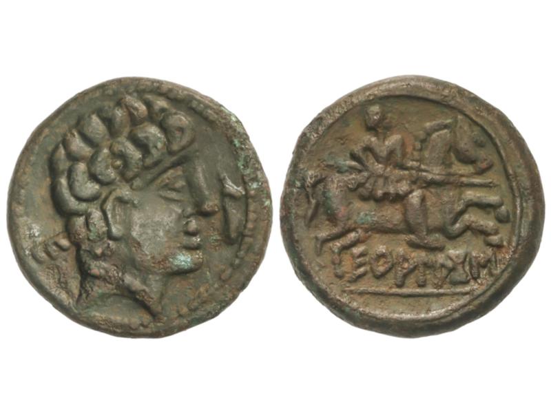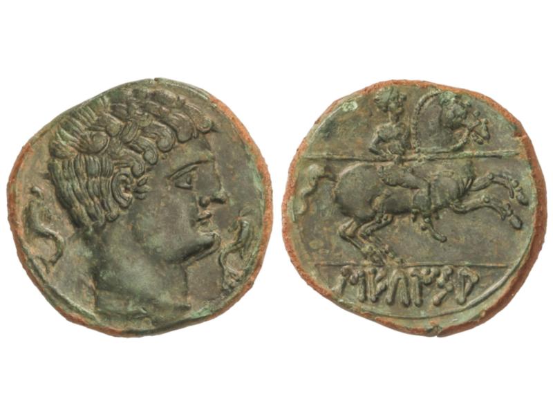 As. 200-20 a.C. ILTIRTA (LLEIDA). Anv.: Cabeza masculina a derecha, rodeada por tres delfines. Rev.: Jinete con palma y clámide a derecha, debajo leyenda ibérica. 13,09 grs. Pátina oscura. AB-1465; ACIP-1261. MBC+/EBC-.
