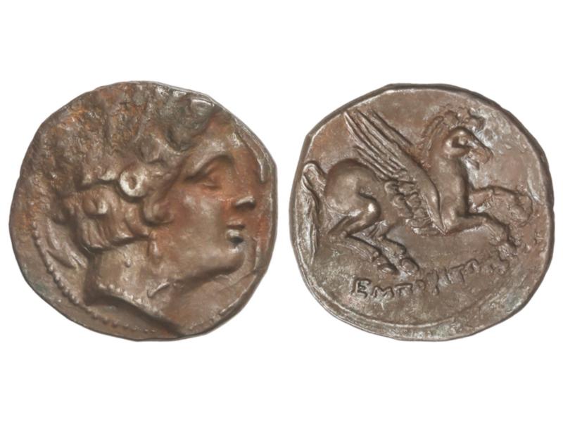 Dracma. 200-110 a.C. EMPORITON (SANT MARTÍ D´EMPÚRIES, Girona). Anv.: Cabeza de Perséfone a derecha, rodeada de tres delfines. Rev.: Pegaso-Crisaor a derecha, debajo leyenda. 4,73 grs. AR. (Leves oxidaciones). Pátina de colección antigua. AB-1108; ACIP-195. MBC+.