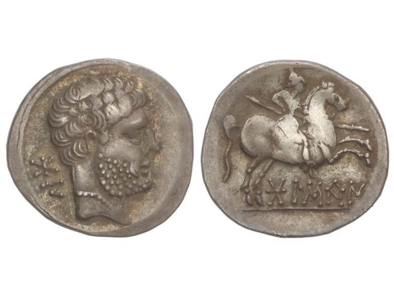 Tetradracma. 359–336 a.C. FILIPO II Acuñación postuma en tiempos de FILIPO III y KASSANDER. MACEDONIA. Anv.: Cabeza de Zeus laureado a derecha. Rev.: Jinete marchando a derecha, debajo serpiente y escudo. 14,29 grs. AR. Espectacular pátina de tonos irisados. BELLÍSIMA. Le
