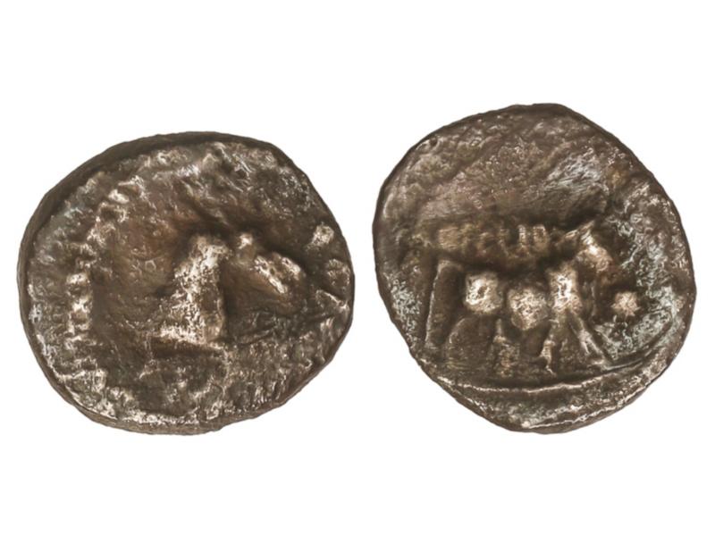 Hemidracma. 300-200 a.C. ARSE (SAGUNTO, Valencia). Anv.: Cabeza de caballo a derecha, delante leyenda ibérica. Rev.: Toro androcéfalo a derecha delante estrella y encima leyenda ARSEETAR. 1,28 grs. AR. (Algunas letras no visibles). Pátina. MUY RARA. AB-2041; ACIP-1940. MBC.