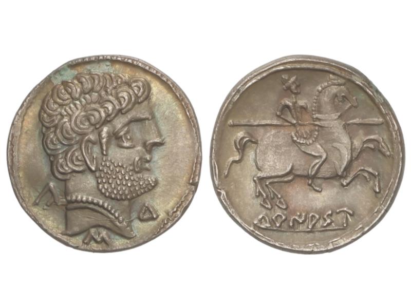 Tetradracma. 359–336 a.C. FILIPO II Acuñación postuma en tiempos de FILIPO III y KASSANDER. MACEDONIA. Anv.: Cabeza de Zeus laureado a derecha. Rev.: Jinete marchando a derecha, debajo serpiente y escudo. 14,29 grs. AR. Espectacular pátina de tonos irisados. BELLÍSIMA. Le