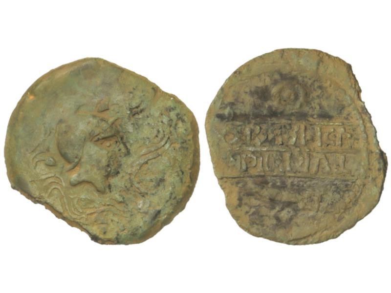 As. 50 a.C. TURRIRREGINA (CASAS DE LA REINA, Badajoz). Anv.: Cabeza masculina con casco a derecha, alrededor tallos de vid. Rev.: Falcata y rodela, entre ambos TVRIRIICINA y leyenda libio-fenicia. 12,36 grs. AE. (Algo recortada pero con leyendas completas). Pátina verde. RARA. A