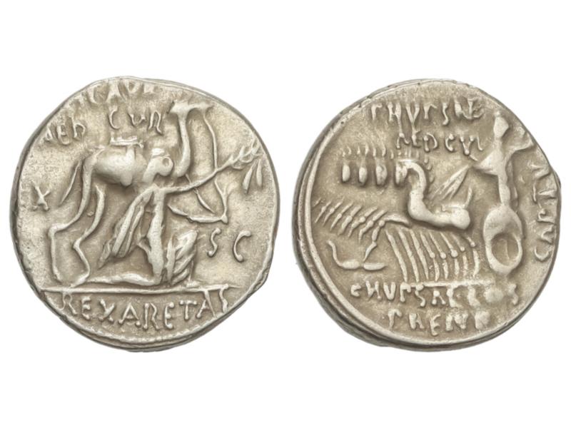 Denario. 58 a.C. AEMILIA. M. Aemilius Scaurusy Pub. Platius Hypsaeus. Anv.: Rey Aretas de rodillas a derecha, detrás camello. Rev.: Júpiter en cuadriga a izquierda escorpión bajo los caballos. 3,82 grs. AR. ESCASA. BMC-3878; Cal-89; Craw-422.1b; FFC-123; Se-8. MBC.
