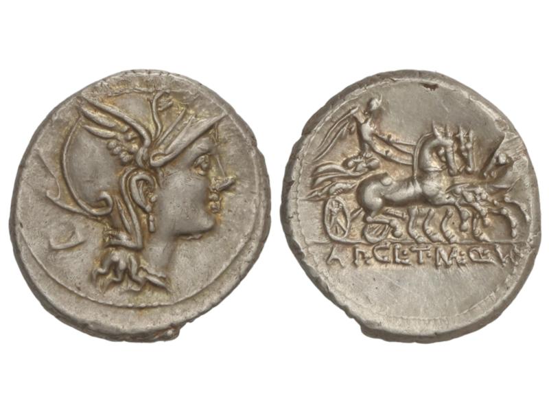 Denario. 110-109 a.C. CLAUDIA. Appius Claudius Pulcher. Anv.: Cabeza de Roma a derecha, detrás objeto triangular. Rev.: Victoria en biga a derecha. En exergo: AP. CL. T. MANL. Q. VR(MANL y VR nexados). 3,98 grs. AR. BMC-1290; Cal-423; Craw-299/1a; FFC-564; Se-2. EBC-.<