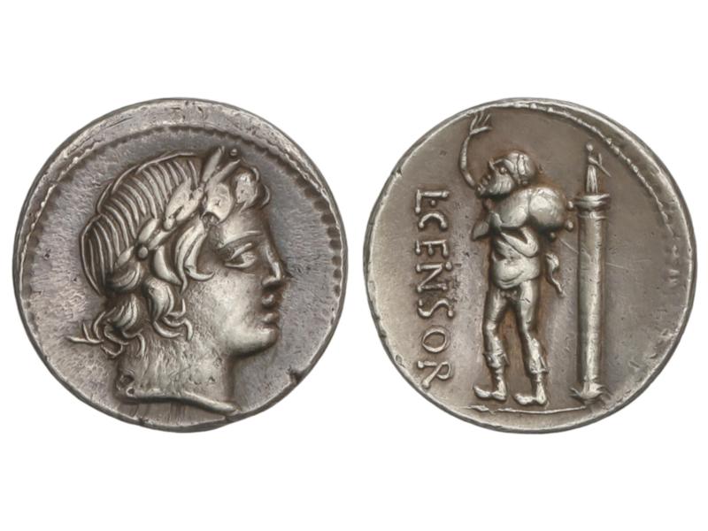 Denario. 88 a.C. MARCIA. L. Marcius Censorinus. Anv.: Cabeza laureada de Apolo a derecha. 3,68 grs. AR. (Anverso algo descentrado). BMC-2657; Cal-957; Craw-363.1d; FFC-888; Se-24. MBC+.
