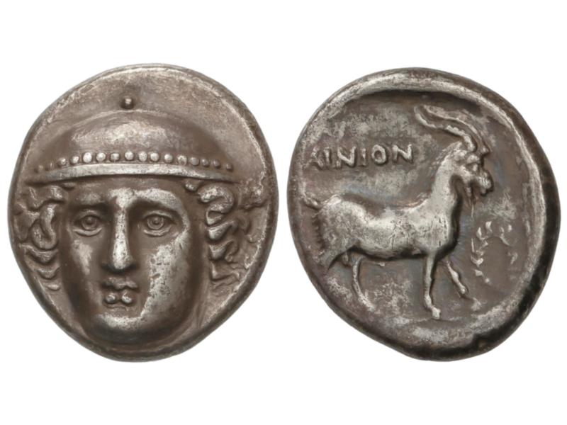 Tetradracma. 400-398 a.C. AINOS. Anv.: Cabeza de Hermes con pétaso de frente. Rev.: AINION. Cabra a derecha, delante corona de laurel. 15,43 grs. AR. Ligera pátina oscura. RARA. HGC 3.2-1278. MBC+/MBC. Ex Gorny & Mosch 100 - 20 noviembre 1999, n. 1017.