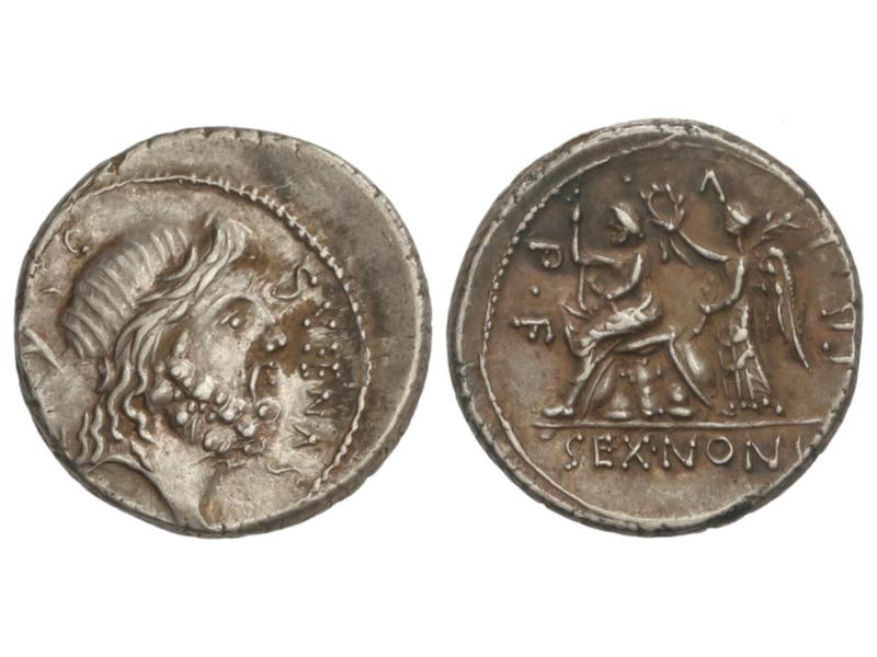 Denario. 59 a.C. NONIA. M. Nonius Sufenas. Anv.: Cabeza de Saturno a derecha entre vaso, arpa, SC y SVFENAS. Rev.: Roma sentada a izquierda coronada por Victoria P.R.L.V.P.F En exergo: SEX. NONI. 3,97 grs. AR. Pátina. BMC-3820; Cal-1048; Craw-421/1; FFC-941; Se-1. MBC+