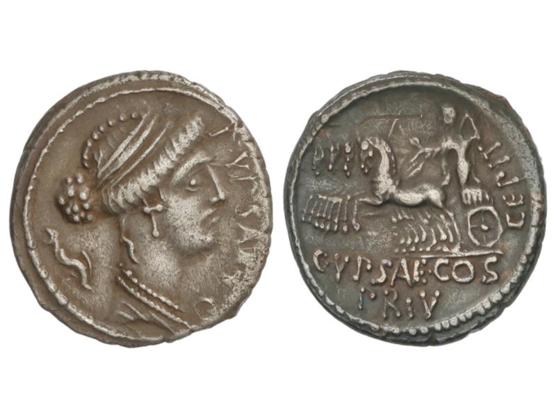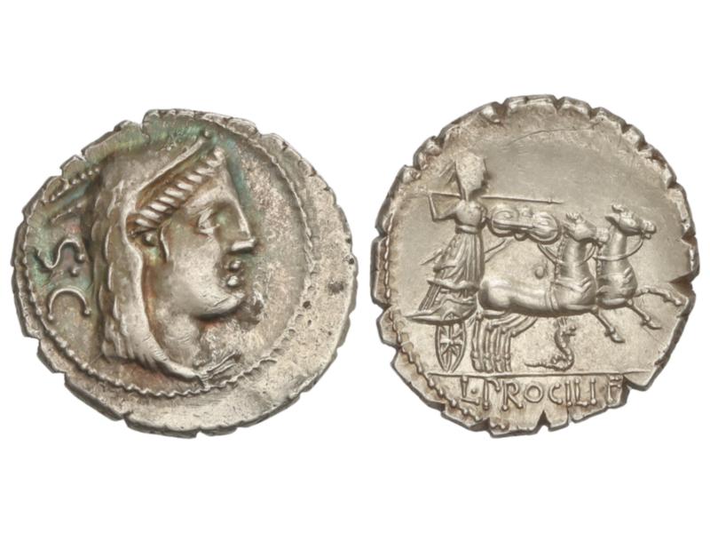 Denario. 80 a.C. PROCILIA. L. Procilius f. Anv.: Cabeza de Juno Sospita a derecha, detrás SC. Rev.: Juno Sospita en biga a derecha, debajo serpiente. 3,91 grs. AR. BMC-3150; Cal-1225; Craw-379/2; FFC-1082; Se-2. EBC.