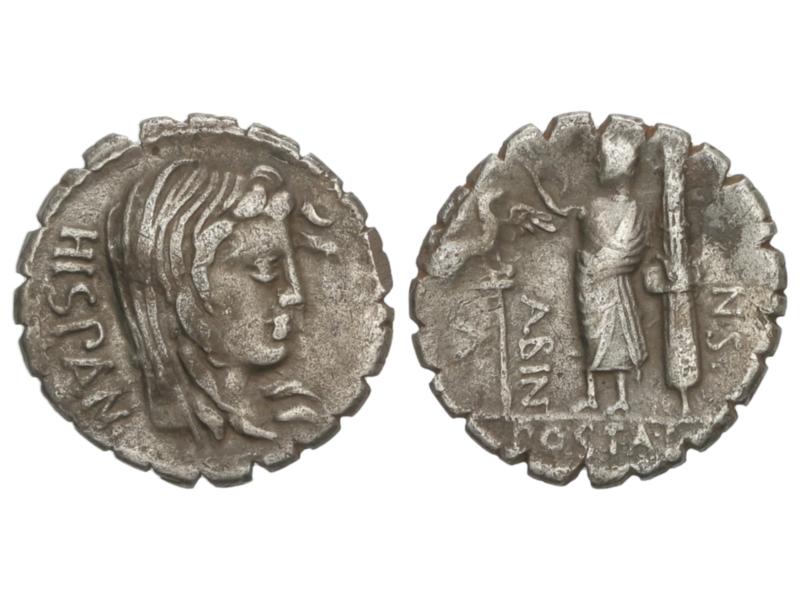 Denario. 81 a.C. POSTUMIA. A. Postumius A.f.Sp.n. Albinus. Anv.: Cabeza velada de Hispania, detrás HISPAN. 3,79 grs. AR. (Oxidaciones limpiadas). BMC-2839; Cal-1216; Craw-372.2; FFC-1072; Se-8. MBC.