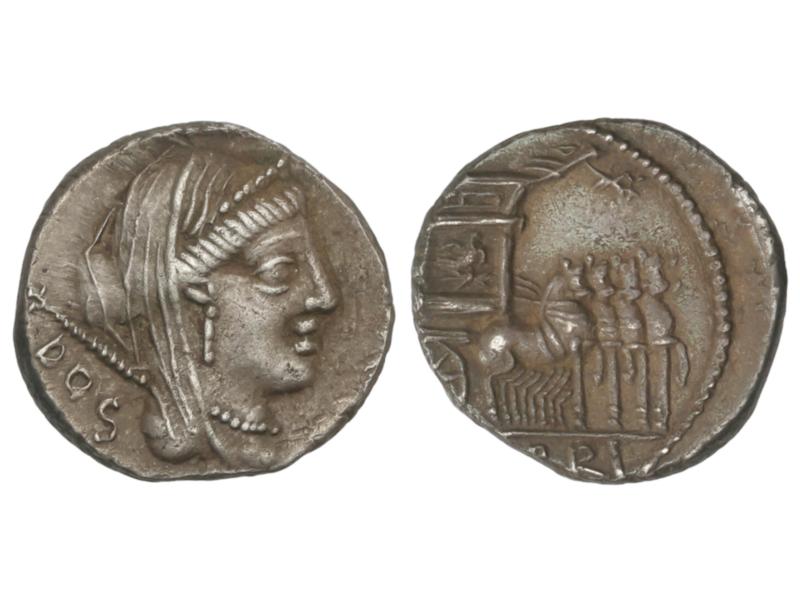 Denario. 87 a.C. RUBRIA. L. Rubrius Dossenus. Anv.: Cabeza de Juno a derecha, detrás DOS. Rev.: Carro triunfal a derecha. En exergo: (L. RV)BRI. 3,77 grs. AR. (Reverso descentrado). Pátina. BMC-1252; Cal-1233; Craw-348/3; FFC-1092; Se-2. EBC-.