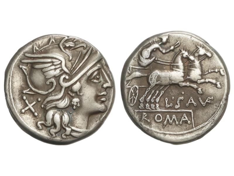 Denario. 152 a.C. SAUFEIA. L. Saufeius. Rev.: Victoria con látigo en biga a derecha. 3,53 grs. AR. BMC-834; Cal-1245; Craw-204.1; FFC-1099; Se-1. MBC+.
