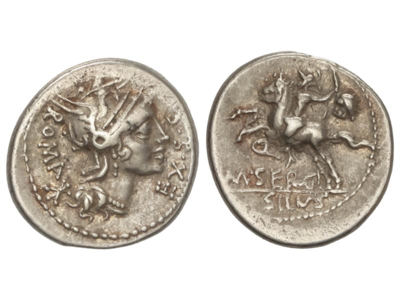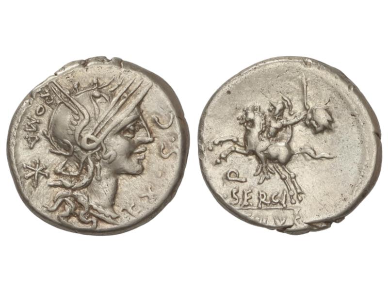 Denario. 116-115 a.C. SERGIA. M. Sergius Silus. Rev.: Jinete con espada a izquierda, en el campo cabeza de galo. 3,94 grs. AR. BMC-517; Cal-1271; Craw-286.1; FFC-1111; Se-1. MBC+.