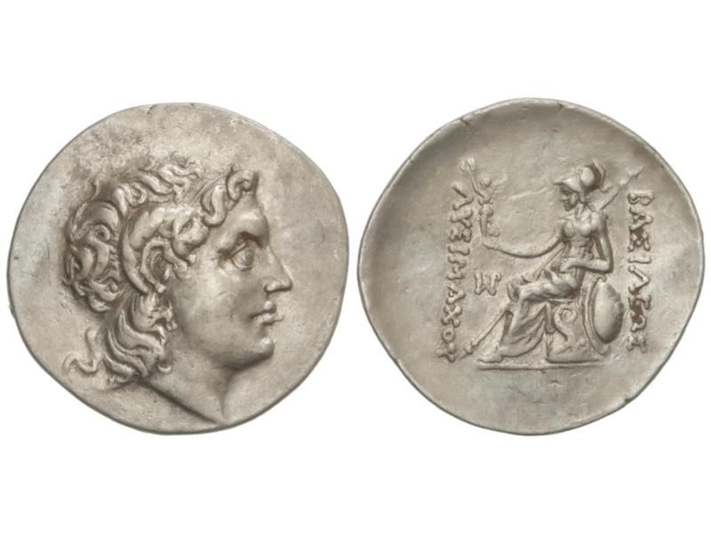 Dracma. 305-281 a.C. LISÍMACO. REINO DE TRACIA. Anv.: Cabeza de Alejandro Magno a derecha con el cuerno de Amón. Rev.: [[g1g0h7g8h0g4i3h7]] / [[h0h9h7h1g0i1h4h9]]. Atenea sentada a izquierda sosteniendo a Nike, alrededor monograma y leyenda. 16,89 grs. AR. (Leves golpecit