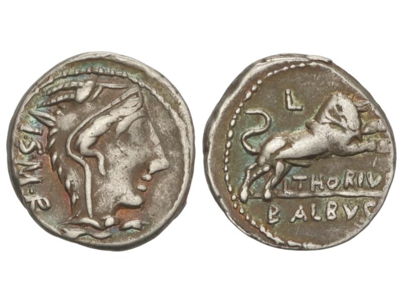 Denario. 105 a.C. THORIA. L. Thorius Balbus. Anv.: Cabeza de Juno Sospita a derecha cubierta con piel de cabra, detrás I.S.M.R. Rev.: Toro a derecha, encima letra L, debajo L. THORIVS. En exergo: BALBVS. 3,87 grs. AR. BMC-1615-41; Cal-1300; Craw-316/1; FFC-1141; Se-1.