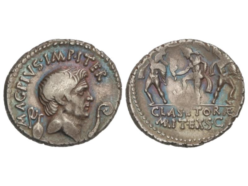 Denario. 42-40 a.C. POMPEYO EL GRANDE. Sex. Pompeius Magnus. Anv.: MAG. PIVS IMP. ITER. Cabeza descubierto de Pompeyo el Grande a derecha, delante lituo, detrás praeferículo. Rev.: PRAEF. CLAS. ET. ORAE. MARIT. EX. S.C. Anapias y Anhphinomus trasladando a sus padre a homb
