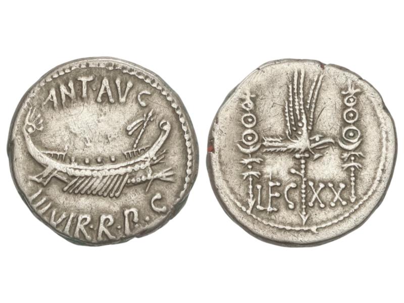 Denario. 32-31 a.C. MARCO ANTONIO. CECA VOLANTE. Anv.: ANT. AVG. III. VIR. R.P.C. Galera pretoriana a derecha. Rev.: LEG. XX. Águila legionaria entre dos insignias. 3,70 grs. AR. C-57; Craw-544/36; BMC-215. MBC+.