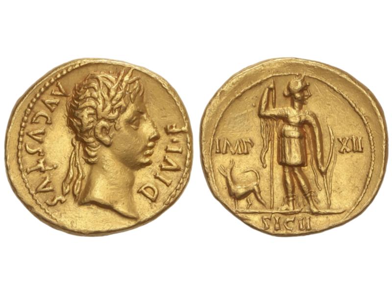 Áureo. 12-11 a.C. AUGUSTO. Anv.: AVGVSTVS DIVI F. Cabeza laureada de Augusto a derecha. Rev.: IMP. XII SICIL. Diana cazadora en pie mirando a derecha, con jabalina y arco; a izquierda perro. 7,94 grs. AU. MAGNÍFICA PIEZA. MUY RARA. C-169; RIC-341; XC-232 (mismo ejemplar). (EB