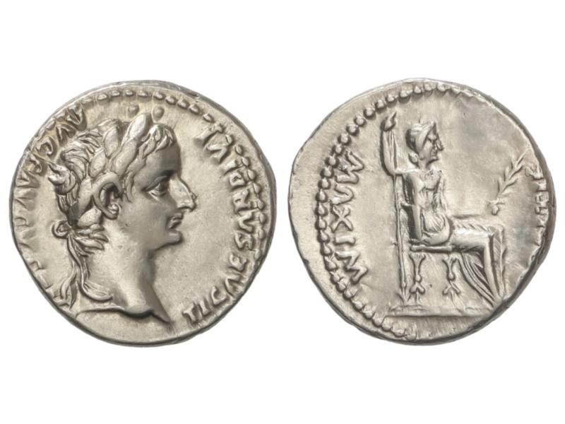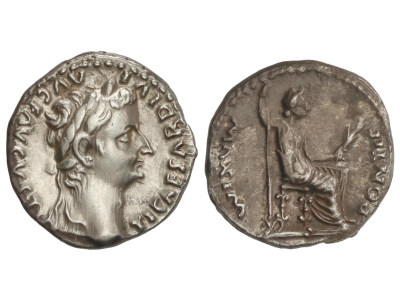 Denario. 14-37 d.C. TIBERIO. LUGDUNUM (Lyon). Anv.: TI. CAESAR DIVI AVG. F. AVGVSTVS. Cabeza laureada de Tiberio a derecha. Rev.: (PONTIF.) MAXIM. Livia sentada a derecha en silla ornamentada. 3,76 grs. AR. ( (Algo descentrada en reverso). C-16; RIC-30; BMC-48. EBC-. E