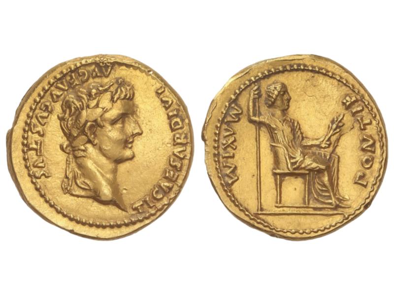 Áureo. 14-17 d.C. TIBERIO. LUGDUNUM (Lyon). Anv.: TI. CAESAR DIVI AVG. F. AVGVSTVS. Cabeza laureada de Tiberio a derecha. Rev.: PONTIF. MAXIM. Livia sentada a derecha con cetro y flor. 7,78 grs. AU. C-15; RIC-27; XC-305. EBC.