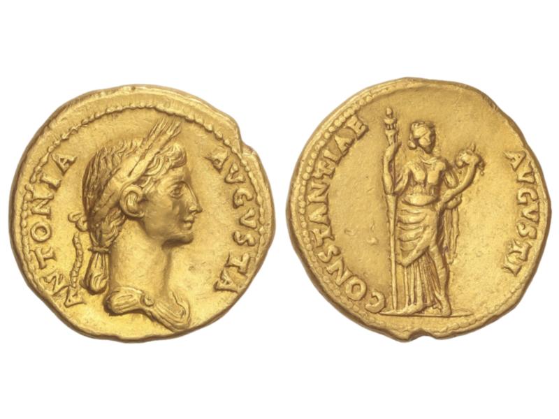 Áureo. 41-45 d.C. ANTONIA. Anv.: ANTONIA AVGVSTA. Busto drapeado y coronado de espigas de Antonia a derecha. Rev.: CONSTANTIAE AVGVSTI. Constantia en pie de frente con antorcha y cornucopia. 7,80 grs. AU. Conmemoración de Claudio. (Pequeña grieta en canto). C-1; RIC-65; XC-318.