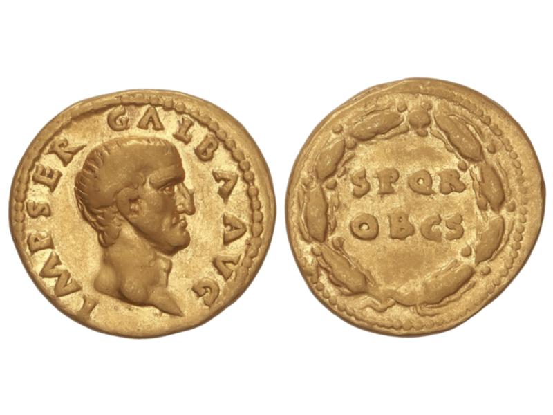 Áureo. 68-69 d.C. GALBA. Anv.: IMP. SER. GALBA AVG. Busto descubierto a derecha. Rev.: S. P. Q. R. OB. C. S. En dos líneas y dentro de corona de roble. 7,23 grs. AU. Acuñación floja. Restos de brillo original. RARA. C-286; RIC-164; XC-509. (EBC-/MBC+). Ex Soler y Llach y Mart