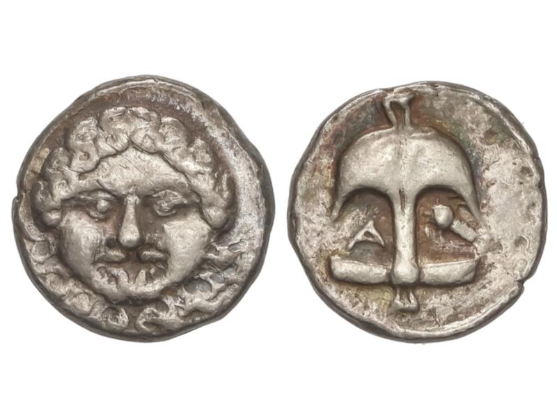 Dracma. 450-400 a.C. APOLONIA PONTIKA. Anv.: Cabeza de Gorgona de frente. Rev.: Ancla. 2,88 grs. AR. Se-1655. MBC+.