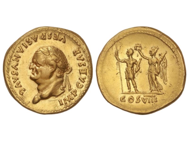 Áureo. 77-78 d.C. VESPASIANO. Anv.: IMP. CAESAR VESPASIANVS AVG. Cabeza laureada de Vespasiano a izquierda. Rev.: COS. VIII. Vespasiano de pie a izquierda, con lanza y rollo en su izquierda, es coronado por Victoria con palma. 7,39 grs. AU. C-131; RIC-936; XC-625. EBC/EBC-. E