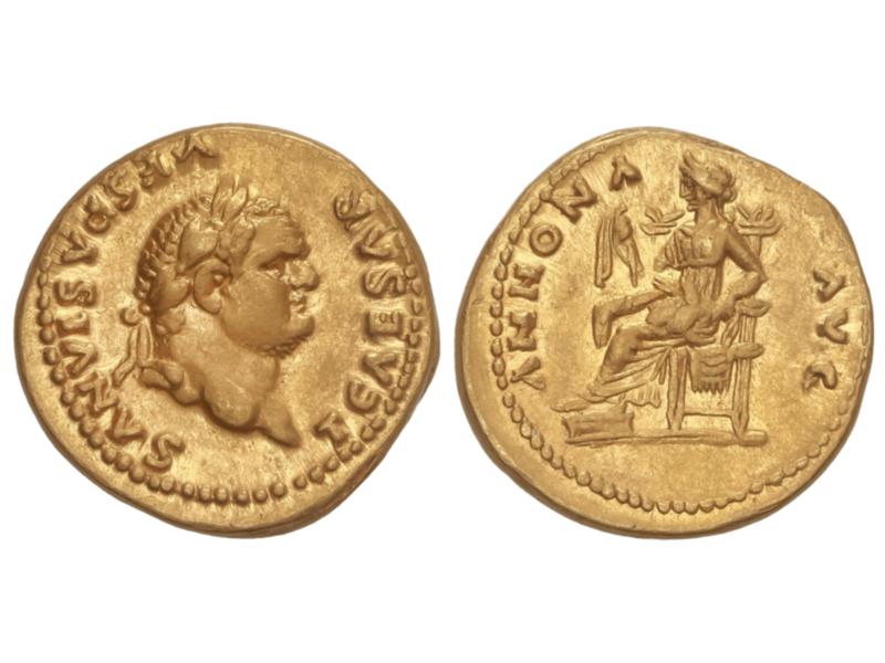 Áureo. 78-79 d.C. VESPASIANO. Anv.: CAESAR VESPASIANVS AVG. Cabeza laureada de Vespasiano a derecha. Rev.: ANNONA AVG. Annona sentada a izquierda. 7,27 grs. AU. Restos de brillo original. C-27; RIC-963; XC-590. EBC. Ex Soler y Llach y Martí Hervera 1078 - 29 octubre 2013, n.