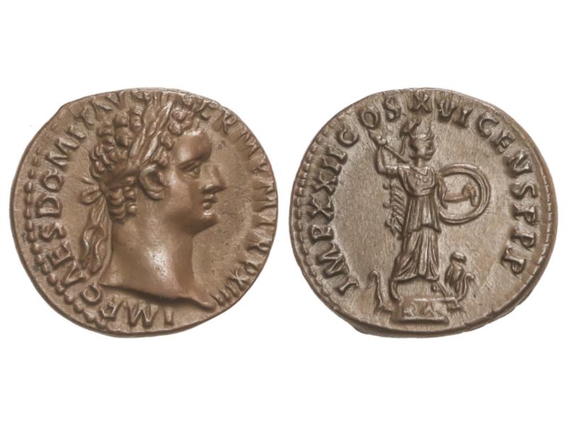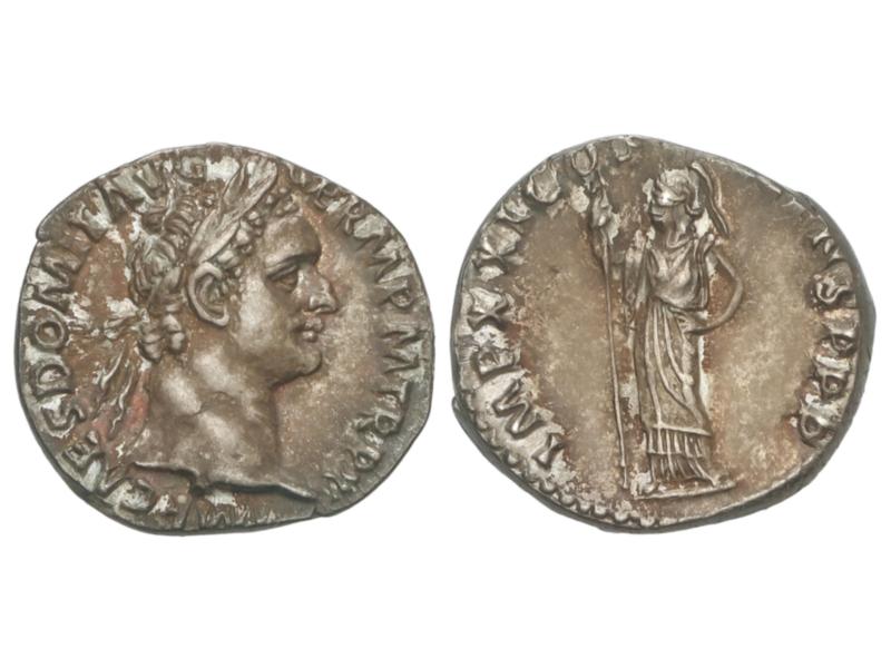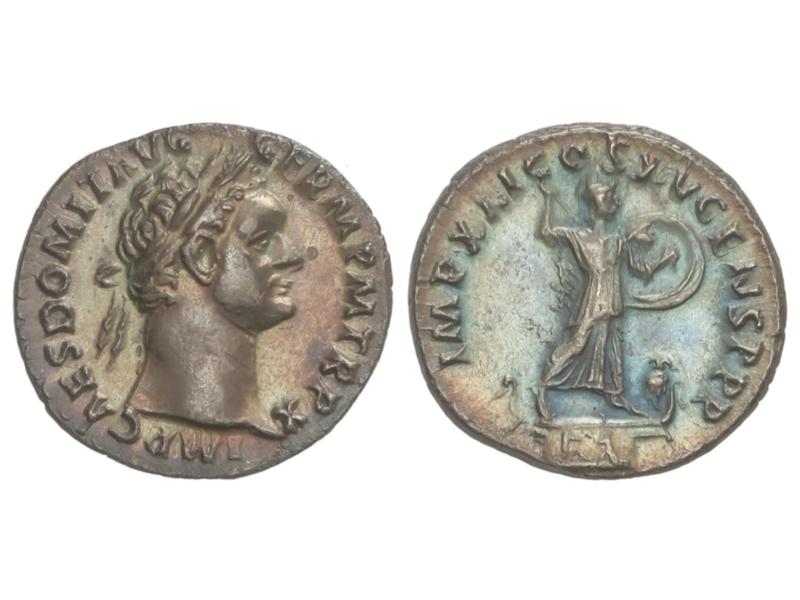 Denario. 90-91 d.C. DOMICIANO. Anv.: IMP. CAES. DOMIT. AVG. GERM. P.M. TR.P. X. Busto laureado a derecha. Rev.: IMP. XXI COS. XV CENS. P.P.P. Minerva blandiendo javalina a derecha con escudo. 3,19 grs. AR. Pátina. C-266; RIC-153; BMC-179. EBC-/MBC+.