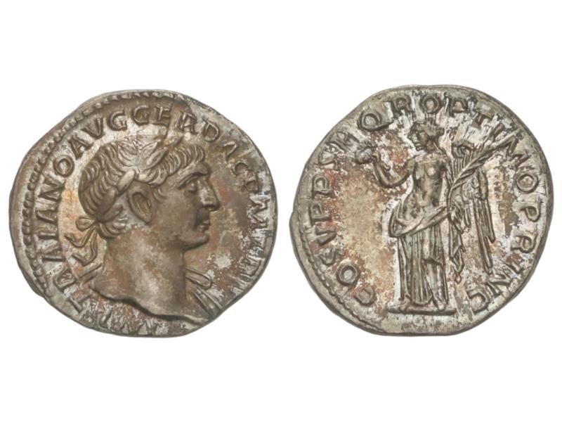 Denario. 103-112 d.C. TRAJANO. Anv.: IMP. TRAIANO AVG. GER. DAC. P. M. TR. P. Busto laureado a derecha. Rev.: COS. V. P. P. S. P. Q. R. OPTIMO PRINC. Victoria a izquierda. 3,46 grs. AR. Pátina, parte brillo original. C-74; RIC-128; BMC-328. EBC.