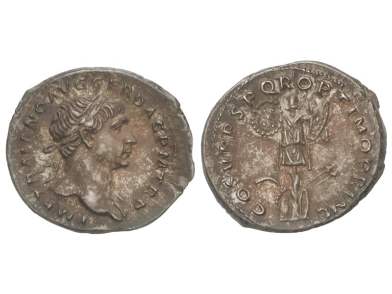 Denario. 112-117 d.C. TRAJANO. Anv.: IMP. TRAIANO AVG. GER. DAC. P. M. T. R. P. COS. VI P. P. Busto laureado a derecha. Rev.: S. P. Q. R. OPTIMO PRINCIPI. Marte con lanza y trofeo a derecha. 3,01 grs. AR. Pátina. C-372; RIC-270; BMC-415. EBC-.