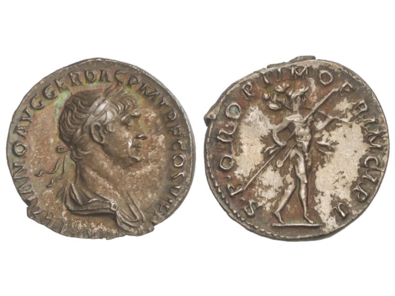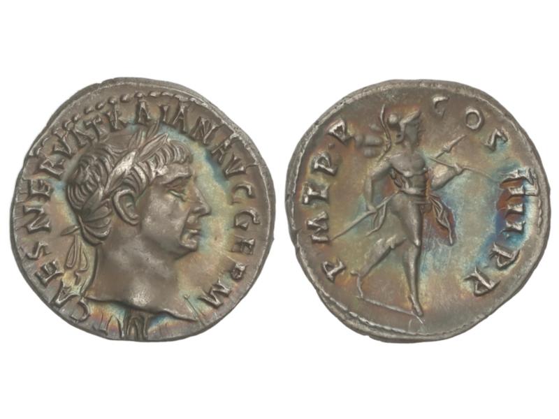 Denario. 98-111 d.C. TRAJANO. Anv.: IMP. CAES. NERVA. TRAIAN. AVG. GERM. Cabeza laureada a derecha. Rev.: P. M. TR. P. COS. IIII P. P. Marte a derecha con lanza y trofeo. 3,19 grs. AR. Pátina irisada. C-228; RIC-52; BMC-94. EBC/EBC-.