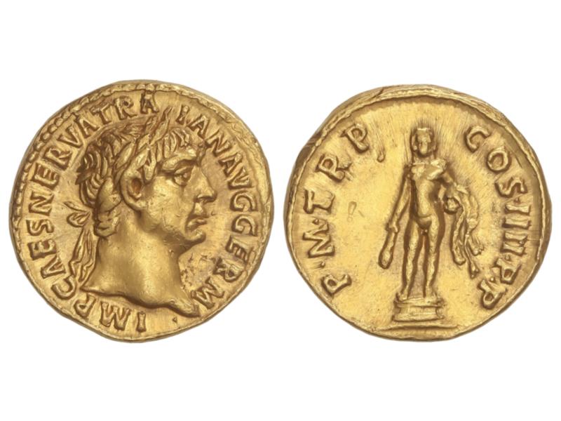Áureo. 101-102 d.C. TRAJANO. Anv.: IMP. CAES. NERVA TRAIAN. AVG. GERM. Cabeza laureada de Trajano a derecha. Rev.: P. M. TR. P. COS. IIII P. P. Hércules en pie de frente sobre altar con maza y piel de león. 6,72 grs. AU. (Muy leves golpecitos). C-231; RIC-49; XC-1052. (EBC).